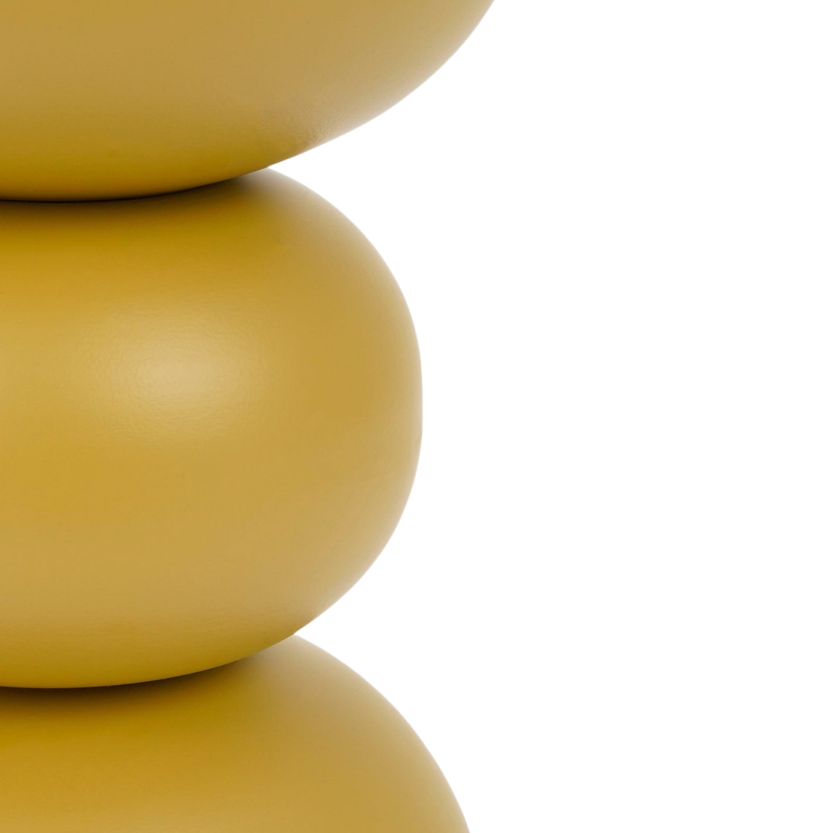 Dieser runde Beistelltisch aus Metall setzt einen klaren Akzent neben Sofa oder Sessel. Die skulpturale, organische Form mit drei übereinander gestapelten Elementen wirkt modern und ruhig zugleich. Die matte gelbe Oberfläche bringt Style in dein Wohnzimmer und lässt sich vielseitig kombinieren. Die kompakte Größe passt ideal in kleine Räume, als Nachttisch im Schlafzimmer oder als Ablage im Flur. Ob Vase, Buch oder Tablett, die stabile Platte trägt deine Deko sicher und wertet jeden Platz sofort auf. Maße 32 x 32 cm Höhe 46 cm.